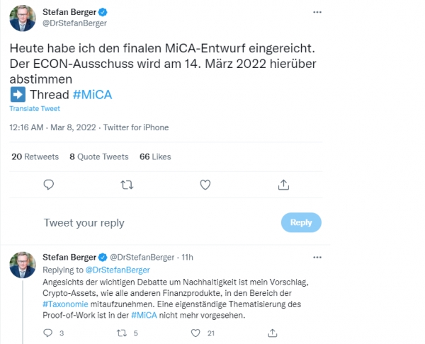 해당 규제 안을 추진한 독일의 스테판 버거(Stefan Berger) 유럽연합 중도우파 보고관은 지난 3월 7일(현지시간) 개인 트위터 계정을 통해 “오늘 최종 MiCA 초안을 제출했다”라며 “MiCA에서는 더 이상 작업 증명의 독립적인 주제화를 제공하지 않을 것이다”라고 말했다.