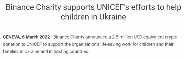 국제 연합(UN)의 아동기금인 유니세프(UNICEF)가 지난 3월 6일(현지시간) 공식 웹사이트를 통해 글로벌 가상화폐 거래소인 바이낸스(Binance)의 250만 달러(한화 약 31억 원) 규모 우크라이나 어린이 지원 기금 납부에 대한 감사의 말을 전했다.