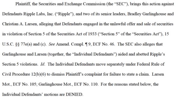 뉴욕 남부지방법원(Southern New York District Court)이 지난 3월 11일(현지시간) 미등록 증권 판매 여부를 둘러싸고 블록체인 송금업체인 리플랩스(Ripple Labs)와 미국 증권거래위원회(이하 SEC)가 제출한 양측의 모션(motion)을 모두 기각하는 판결을 내렸다.