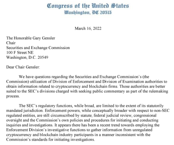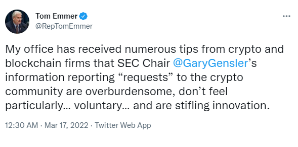 미국 의회 블록체인 회의(Congressional Blockchain Caucus)의 의장인 톰 에머(Tom Emmer) 하원의원이 3월 16일(현지시간) 미국 증권거래위원회(SEC)의 개리 겐슬러(Gary Gensler) 위원장에게 가상화폐 기업 정보 수집 방법을 명확히 하며 비효율적인 관행은 철회하라고 요청하는 서한을 보냈다.