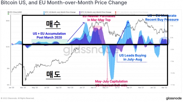 블록체인 데이터 분석업체인 글래스노드(Glassnode)가 3월 22일 자체 소식지를 통해 동양과 서양의 가상화폐 투자 추세에 관한 분석을 공개했다.