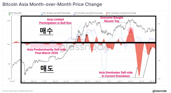 한편 블록체인 데이터 분석업체인 글래스노드(Glassnode)는 지난 3월 22일 가상화폐 투자에 있어 동양과 서양 시장 참여자들이 다른 추세를 보인다고 분석했다.