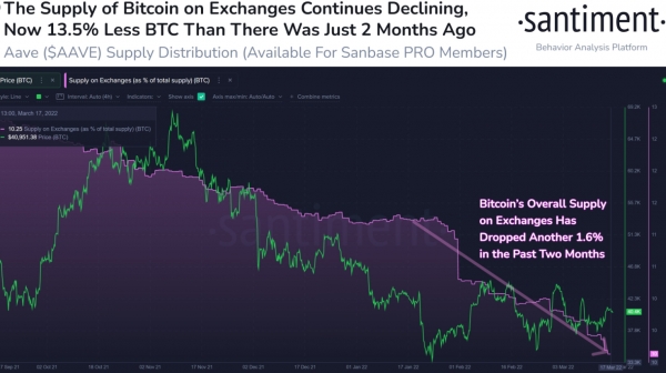 블록체인 분석업체 샌티먼트(Santiment)가 지난 3월 18일 가상화폐 거래소 내 비트코인 공급 추세가 3년 만에 최저치를 기록하고 있다는 분석을 내놓았다. 해당 업체는 비트코인 공급 비율이 두 달여 만에 13.5% 감소했다고 짚었다.