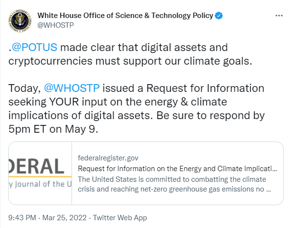 백악관 과학기술정책실은 “조 바이든은 디지털 자산과 가상화폐 산업이 미국의 기후변화 목표를 지원해야 한다는 것에 대해 분명한 의사표시를 했다”라며 “이에 따라 우리 기관은 오는 5월 9일(현지시간)까지 대중 의견을 취합할 예정이다”라고 말했다.
