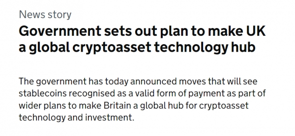 영국 정부는 공식 성명을 통해 “스테이블 코인 규제를 통해 우리 정부는 잠재력 있는 새로운 기술에 대한 금융 안정성과 높은 규제 기준을 보장할 것이다”라며 “블록체인 기술과 스테이블 코인 사용을 통해 영국 금융 시장은 능률과 투명성 및 복원력을 잠재적으로 더 높일 수 있을 것이다”라고 언급했다.