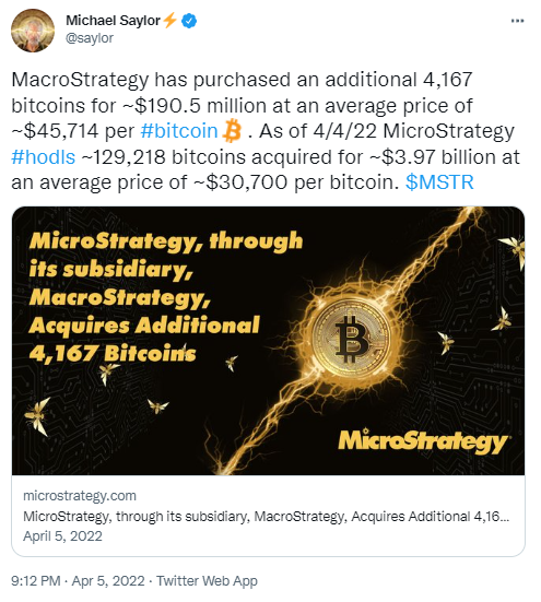 비트코인 전도사로 알려진 마이클 세일러(Michael Saylor) 마이크로 스트래티지(Micro Strategy) 최고경영자가 지난 4월 5일(현지시간) 개인 트위터 계정을 통해 해당 기업이 4천 197개의 비트코인을 추가로 구매했다고 발표했다.
