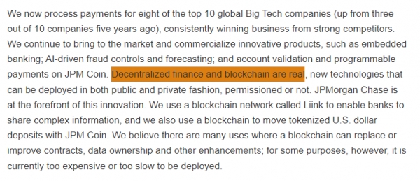 제이미 다이먼 최고경영자는 주주 서한에서 블록체인의 단점에 대해서도 언급했다. 그는 블록체인 기술이 목적에 따라 단가가 비싸거나 느린 속도를 갖기도 한다고 덧붙였다.