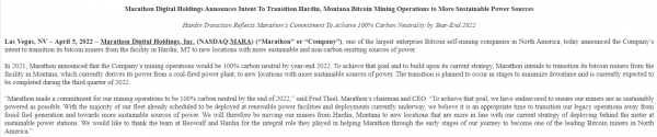 마라톤 디지털 홀딩스는 미국 증권위에 제출한 서류를 통해 “채굴장 이동 결정은 오는 2022년 말까지 100% 탄소중립이 되겠다는 당사의 기존 목표를 달성하기 위한 노력이다”라며 “새로운 장소를 통해 더욱 지속 가능한 동력원을 갖게 될 것이다”라고 말했다.