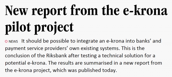 스웨덴 CBDC의 이름은 이-크로나(e-krona)며 스베리예스 릭스방크는 지난 2월 해당 단계 실험을 착수했다. 스베리예스 릭스방크는 이-크로나 시제품의 두 번째 단계 검증을 통해 해당 CBDC가 스웨덴 내 기존 디지털 뱅킹 인프라에서 작용할 수 있는지에 대한 기술적 능력을 확인한 것으로 전해졌다.
