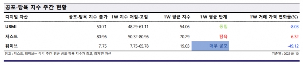 시장 내 투자자들의 참여 심리를 반영하는 공포-탐욕 지수의 지난주 평균은 50.71로 중립 단계로 파악됐다. 해당 기간에 걸쳐 공포-탐욕 지수가 평균적으로 가장 높았던 디지털 자산은 70.29를 기록한 저스트였으며 매우 공포 단계를 나타낸 웨이브는 19.03으로 가장 낮은 수치의 가상화폐였다.