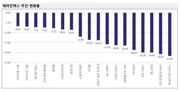 지난 한 주 동안 가상화폐 시장 내 모든 테마의 지수가 하락한 것으로 드러났다. 가장 크게 지수가 떨어진 테마는 21.56%의 하락폭을 기록한 데이터 저장 서비스였다. 반면 이더리움 그룹은 6.66% 지수 감소 결과를 나타내며 시장 내 전체 테마 중 가장 선방하는 움직임을 가져갔다.