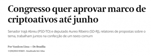 밸러 이코노미코는 비트코인 규제 법안이 4월 중 해당 국가의 입법부인 브라질 국민의회의 표결에 부쳐질 것이라고 덧붙였다. PL 3825/19로 알려진 브라질의 비트코인 법안은 현재 이라자 아부르(Irajá Abreu) 상원의원과 아우레오 히베이루(Ribeiro) 하원의원에 의해 의회 표결을 위한 초안이 작성되고 있는 것으로 전해졌다.
