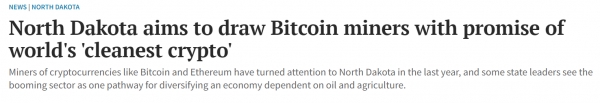 미국의 매체인 인포럼(Inforum)은 지난 4월 11일(현지시간) 노스다코다주 정부가 30억 달러(한화 약 3조 7천억 원) 규모의 친환경 가상화폐 채굴 관련 투자 유치에 성공했다고 보도했다.