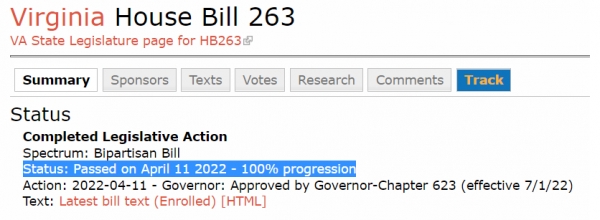 당시 해당 법안은 만장일치의 결과로 버지니아주 의회를 통과했다. 크리스 헤드(Chris Head) 버지니아주 하원의원은 시중 은행이 자산의 위험성을 관리하고 관련 법률 준수 조항을 보유하고 있다는 사실을 토대로 해당 법안을 발의했다.