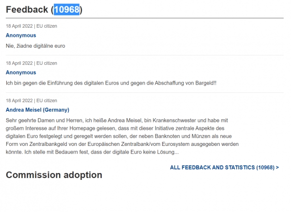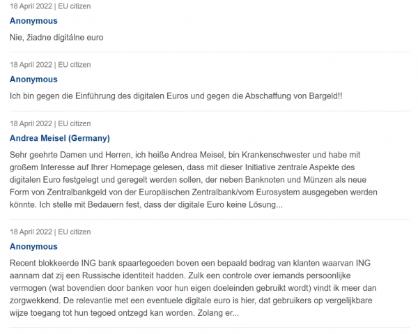 해당 공청 내 상당수의 의견은 독일인으로부터 나오고 있으며 다수의 유럽인들이 현금의 중요성을 이유로 디지털 유로 도입을 반대하고 있는 것으로 확인됐다.