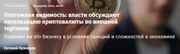 이즈베스티아는 러시아 세무당국이 국가 간 거래 결제 시스템 내 가상화폐 등 디지털 통화 사용을 제안했다고 전했다. 해당 매체는 우크라이나 사태 이후 러시아를 겨냥한 국제사회의 경제 제재가 심화됨에 따라 세무당국이 해당 국가 내 기업들의 국제 무역 결제 선택권을 다방면으로 확보하기 위해 이와 같은 결정을 내렸다고 밝혔다.