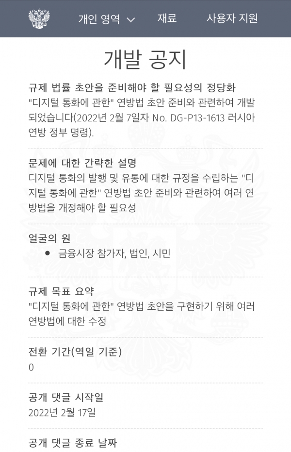 개발통지서는 러시아 정부가 금융시장 참여자와 시민 및 법인의 의견을 취합해 디지털 자산 거래 규칙에 대한 공개 협의를 시작한다는 내용과 연방법 개정에 대한 절차 등을 포함했다.