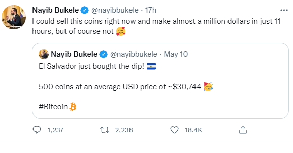 나입 부켈레(Nayib Bukele) 엘살바도르 대통령이 지난 5월 10일(현지시간) 500개의 비트코인 추가매수 소식을 발표한 가운데 현재 해당 국가 정부가 보유 중인 총개수는 2천 301개로 파악됐다.