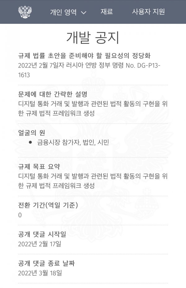 2건의 개발 통지서는 러시아 정부가 오는 3월 19일까지 금융시장 참여자와 시민 및 법인의 의견을 취합해 디지털 자산 거래 규칙에 대한 공개 협의를 시작한다는 내용과 해당 통지서의 영향력으로 발생 가능한 연방법 개정에 대한 절차 등을 포함했다.