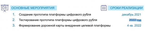 올가 스코로보가토바 부행장은 기관 보고서를 통해 올해 안으로 디지털 루블화 플랫폼 원형 테스트를 진행할 예정이라고 밝혔다. 해당 기관은 디지털 루블화를 공공기관에 대한 지불과 러시아 연방 예산 시스템에서 결제 수단으로 구현할 방침인 것으로 전해졌다.