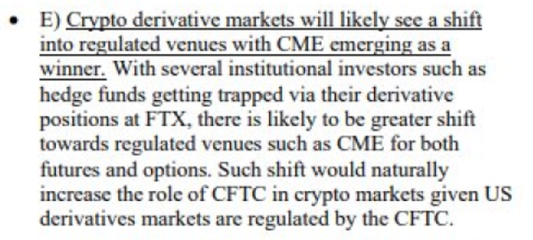 미국 내 가상화폐 규제와 관련해 주목할 만한 니콜라오스 파니기르초글루 전략가의 의견으로는 시카고상품거래소(CME)가 있었다. 시카고상품거래소가 향후 가상화폐 파생상품 시장의 승자로 부상하며 새로운 규제 장소로 전환될 가능성도 있다는 관점이었다.