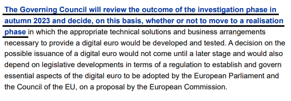 자체 보고서에서 유럽중앙은행은 오는 2023년 가을 디지털유로 조사 단계의 결과를 검토하고 프로젝트가 개발되고 실험될 수 있는 단계로 넘어갈지에 대한 여부를 정하겠다고 전했다.