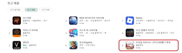 앱 분석 플랫폼 모바일인덱스에 따르면 ‘트릭컬 리바이브’는 10월 1일 구글플레이(이하 구글) 매출 60위에서 4일만에 6위까지 뛰어오르며, 1주년에 세웠던 기존 최고 매출과 타이 기록을 달성했다. 게임은 현재도 구글 매출 9위에 머물러 있다.