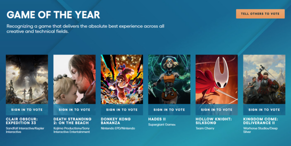 먼저, TGA 2025 올해의 게임 후보로는 ‘클레르 옵스퀴르’, ‘데스 스트랜딩2’, ‘동키콩 바난자’, ‘하데스2’, ‘할로우 나이트: 실크송’, ‘킹덤 컴: 딜리버런스2’ 등 6개 작품이 후보로 이름을 올렸다. 올해 PS5 독점 대형 신작인 ‘고스트 오브 요테이’, 시리즈 흥행 역사를 바꾼 ‘배틀필드6’ 등 경쟁력을 갖춘 작품들이 후보에 오르지 못하는 등 화려했던 2025년 글로벌 게임업계를 잘 보여주는 후보작 목록이다.